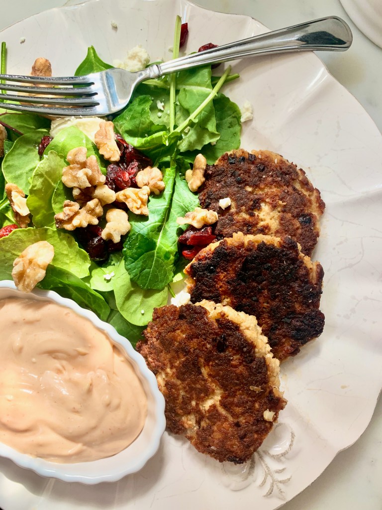 This was a last minute, “I have nothing planned for dinner so what can I throw together from scraps in the cupboard” invention that is now a Friday family favorite (we eat meatless on Fridays all year). The Sriracha in the salmon cakes adds flavor, not heat, and Toby eats them happily (sans the Sriracha aioli). I usually make only half this recipe for our family, which means the whole thing comes together, start to finish, in 15 minutes, but for feeding more than 2 people and a toddler, you should allow extra time for cooking.