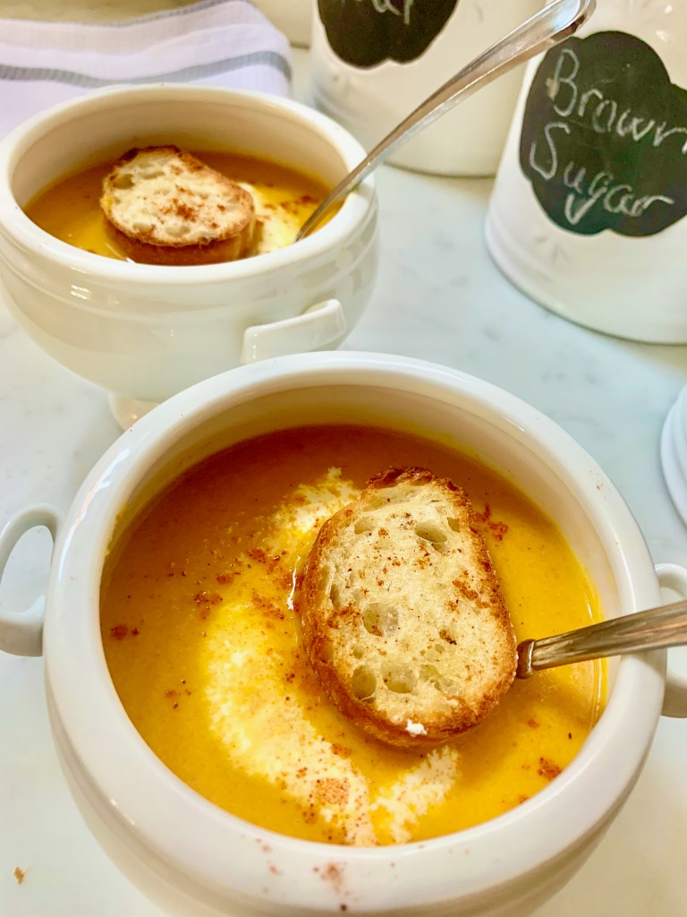 This is one of my absolute favorite easy, healthy, delicious soups. It comes together crazy fast, has so much flavor, and tastes almost as good without the cream and croutons, as it does with them, making it a great allergen friendly recipe. If you’re off the gluten, though, I recommend getting your hands on some good, gluten free bread and coconut cream, because the combination of the toasted bread, cream, and curried soup is pretty amazing.